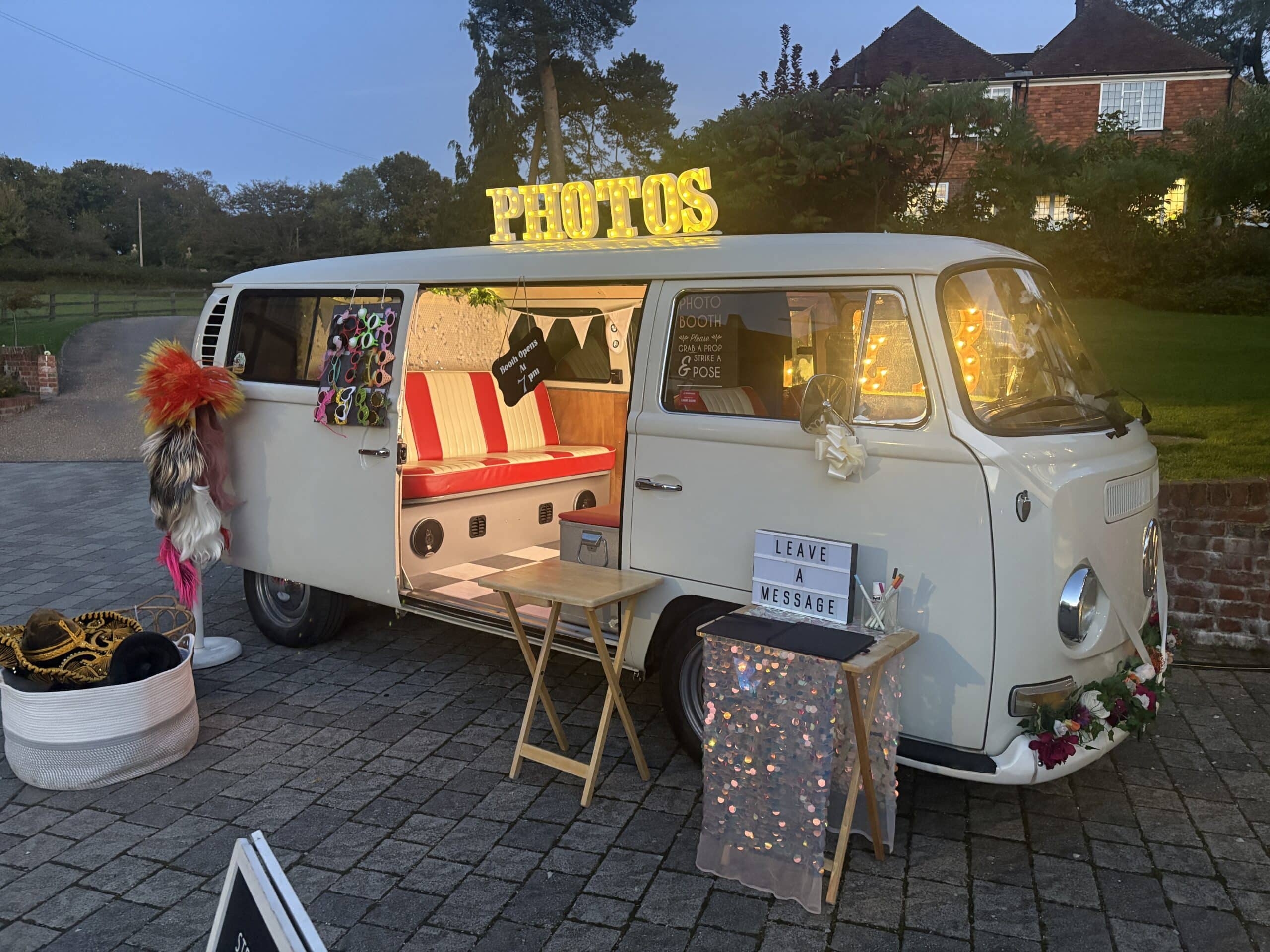 We offer a vintage VW campervan photo booth for weddings and selected events. It is a more characterful alternative to a standard enclosed booth and is especially popular for stylish celebrations where presentation matters.