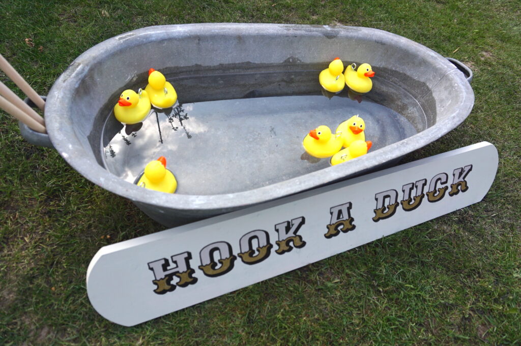 Rustic Hook a Duck in a vintage tin bath. For younger guests. One of our wedding party games. (Please note Bride & Groom can’t be hooked, as they already have been!)